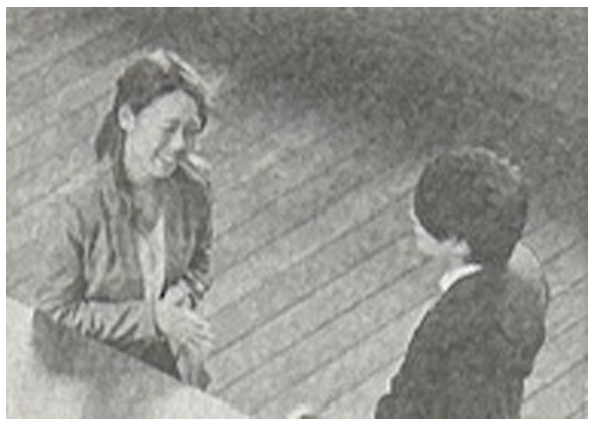 一个女的和一个年轻的男的在照片。看起来他们在像学校的教室,所以他们可能是老师和学生。女的的表情不像老师在指导学生,而是好像在轻松地讲自己的经历等,气氛很随和的感觉。82个字