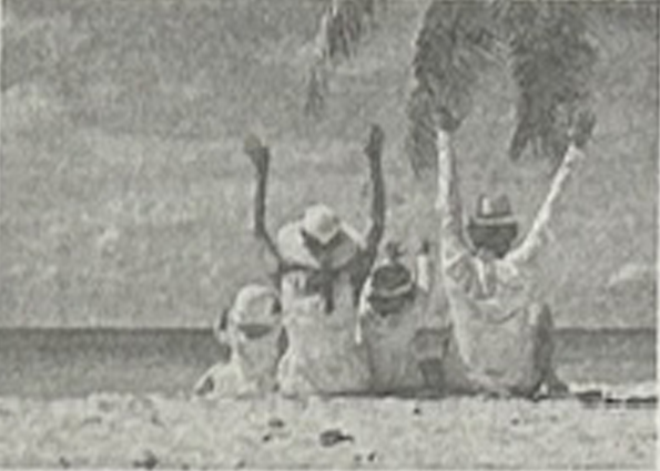 一个年轻的夫妻和他们的两个孩子坐在海边的沙滩上。他们来这里旅游,这儿是在南方很热的观光地,他们都戴着帽子。他们面对着很宽阔的大海,很开心地举起双手,看上去十分幸福。82个字